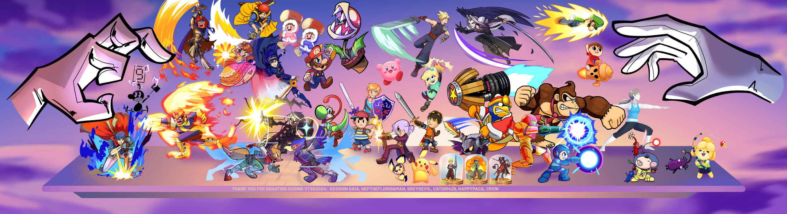 Drawing as many Smash Bros characters as we can! Started as a charity stream for Gamers Outreach in 2024.
